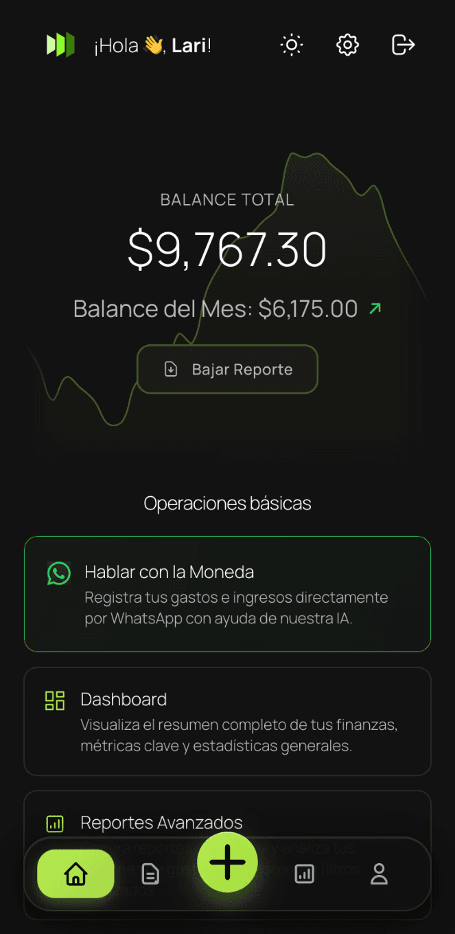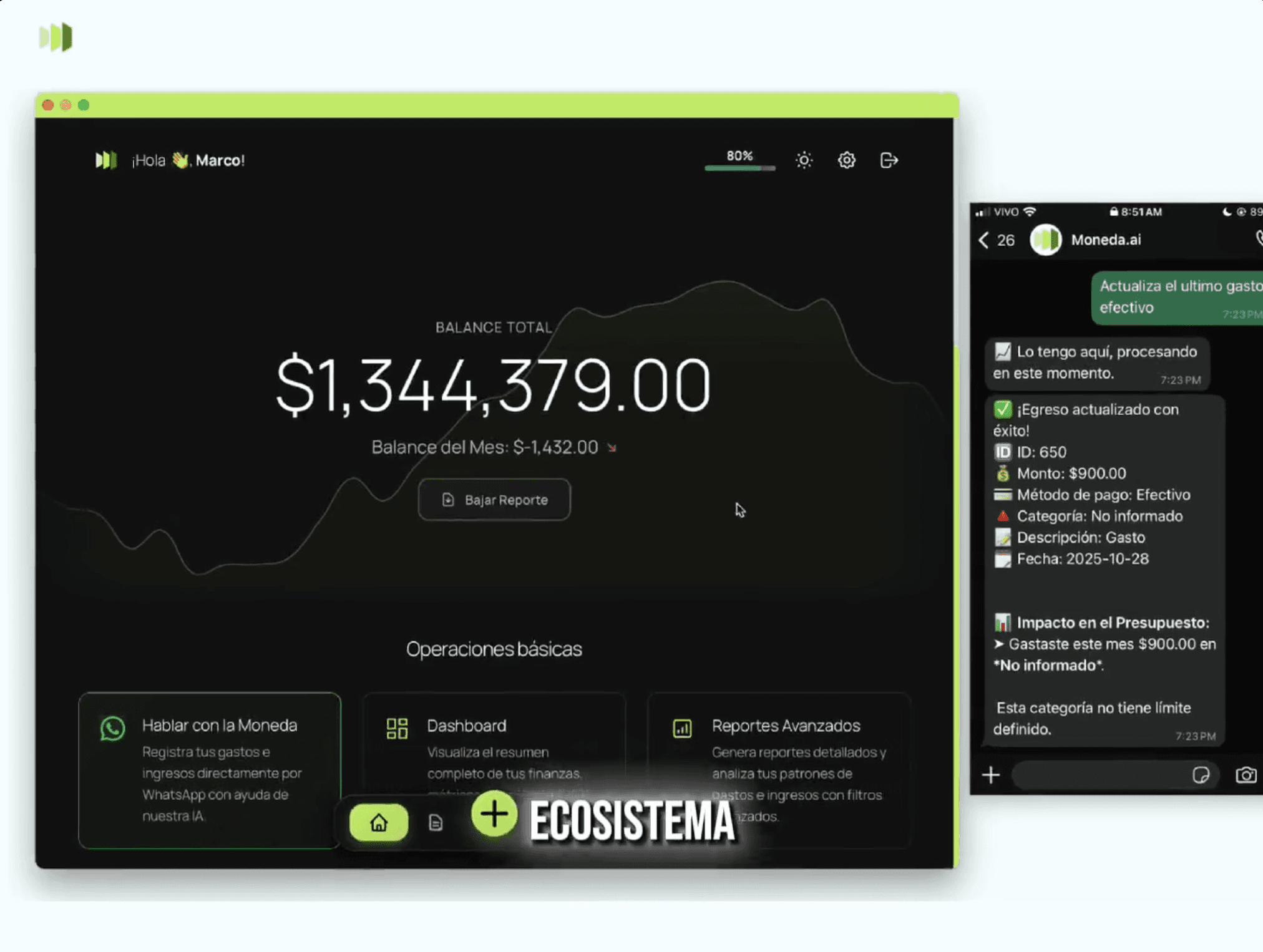 Moneda combina la simplicidad del chat con el poder de un dashboard profesional.