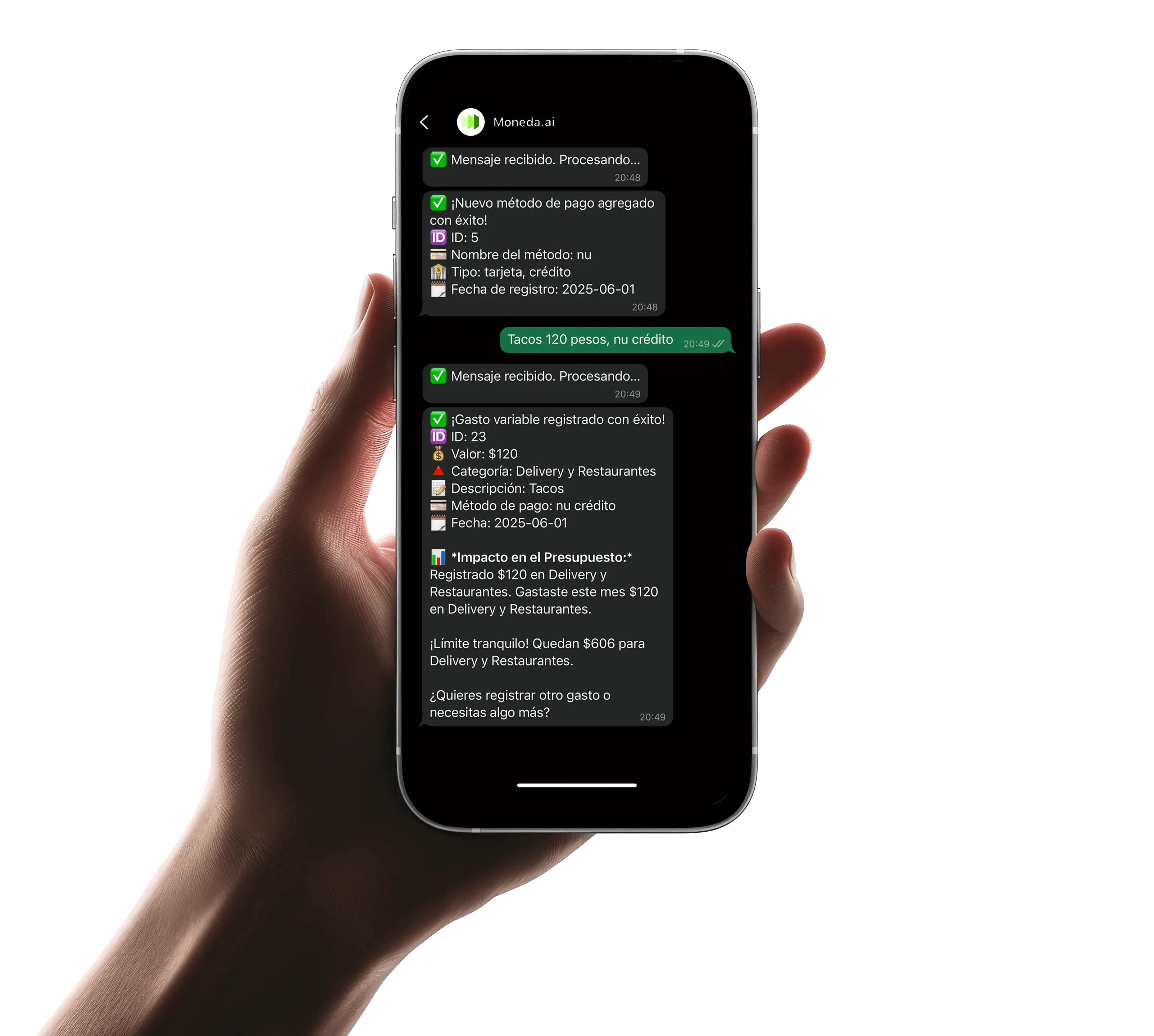 Simplemente envío un audio diciendo 'gasté 50 en súper' y Moneda organiza todo automáticamente.