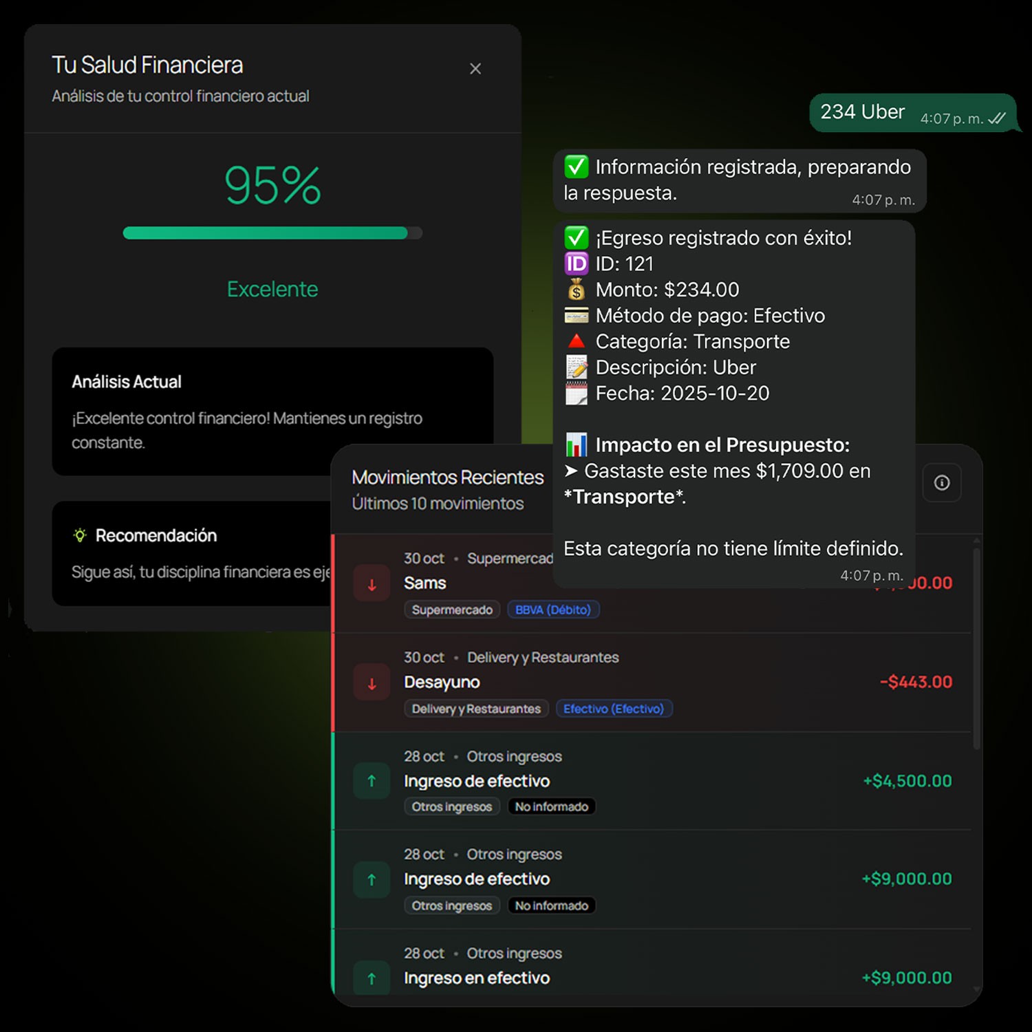 Cada mensaje que envías se transforma en datos reales: ingresos, egresos, presupuestos y recordatorios sincronizados entre WhatsApp y tu dashboard.